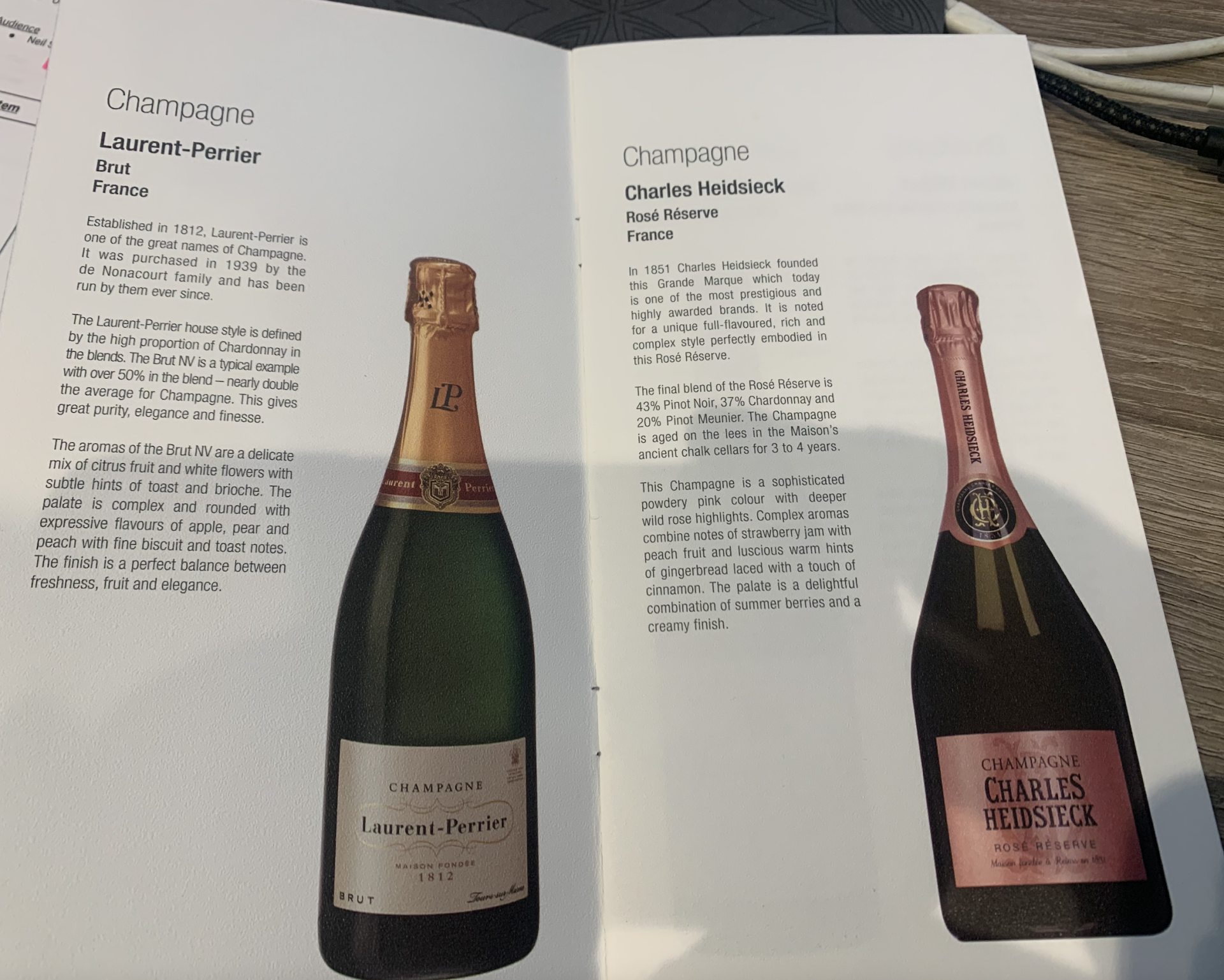 I decided to take a glass of Champagne, which was offered as either Laurent-Perrier Brut or Charles Heidsieck Rose Reserve. The list price per bottle is about £35 and £70 respectively.